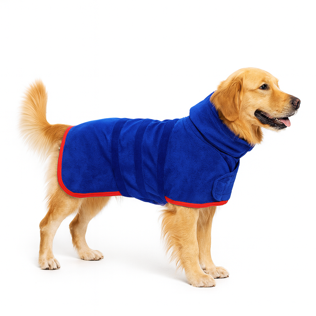 Grâce à ses velcros réglables au cou et à la taille, le peignoir s’ajuste parfaitement et garde votre chien bien au chaud.