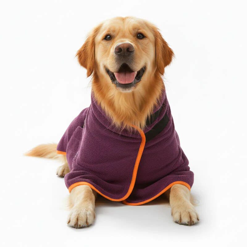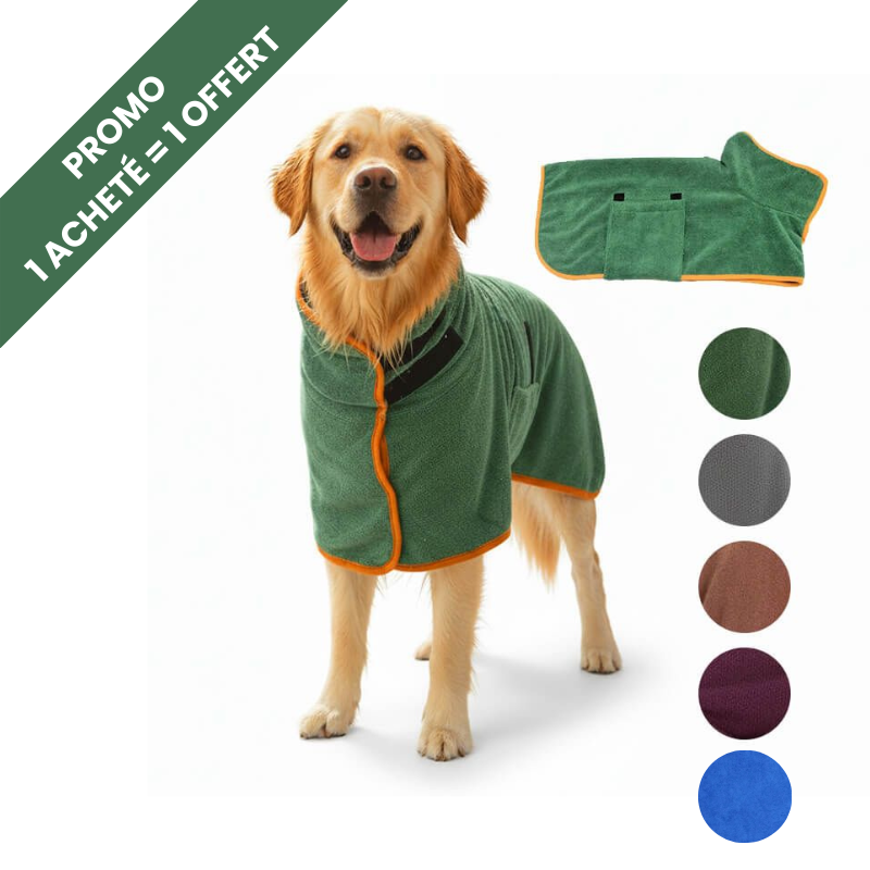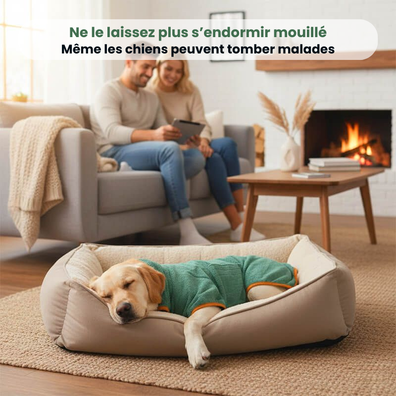 Après la pluie ou l’herbe mouillée, les serviettes ne suffisent pas : ça glisse, ça n’absorbe pas, et votre chien reste humide.